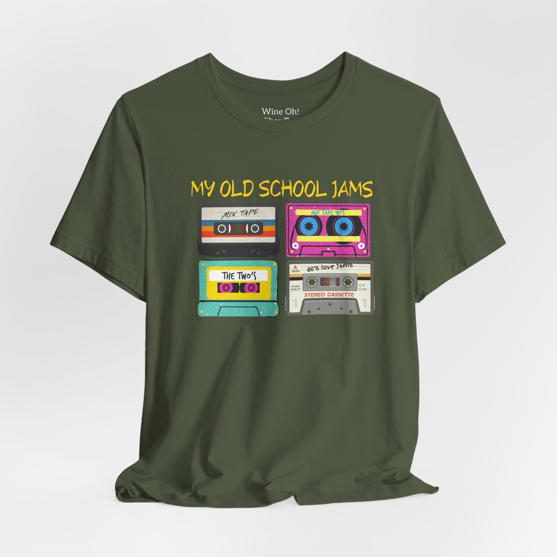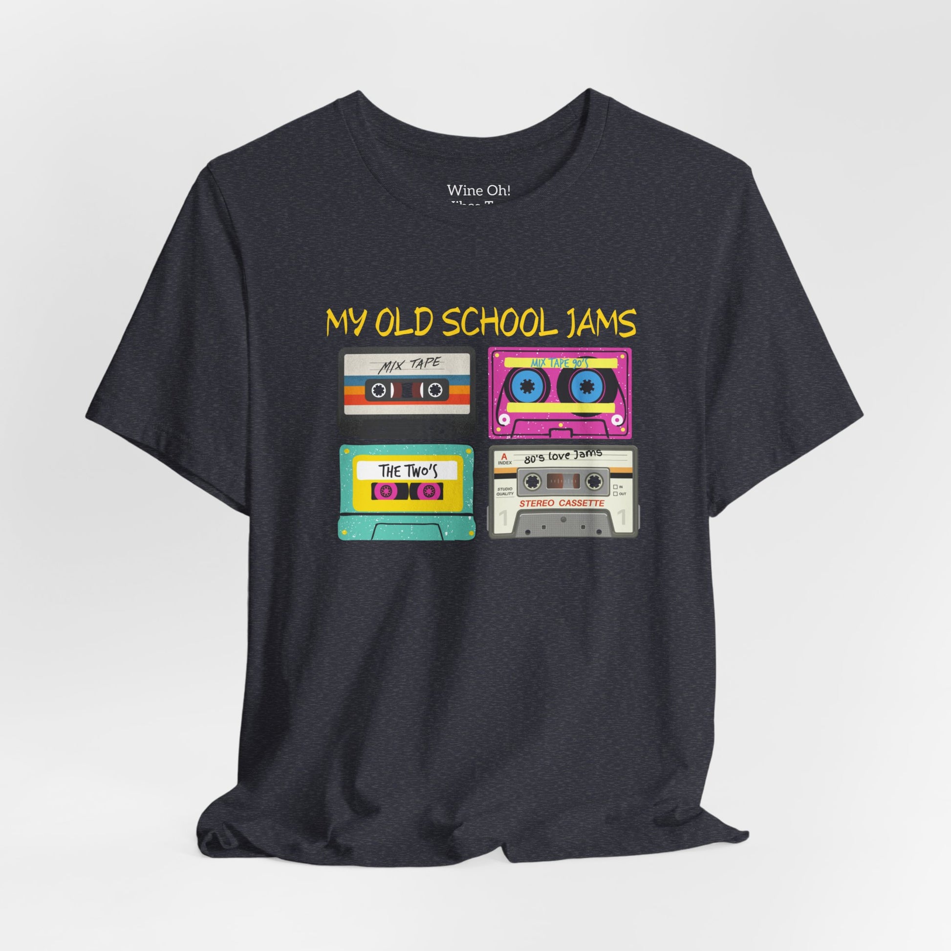 Slip into a tee that hums with nostalgia. This lightweight jersey shirt wears a playful cassette-print across the chest — bright, slightly worn-looking tapes and hand-lettered “MY OLD SCHOOL JAMS” that feel like a mixtape passed between friends. The cotton is soft and breathable, draping easily for daytime errands, backyard barbecues, or lazy weekends flipping through records and memories. It sits neatly at the crew neck and keeps its shape, so the graphic stays front-and-center while you move. Wear it with faded jeans or layer under a flannel for evenings that call for warm conversation and familiar songs.