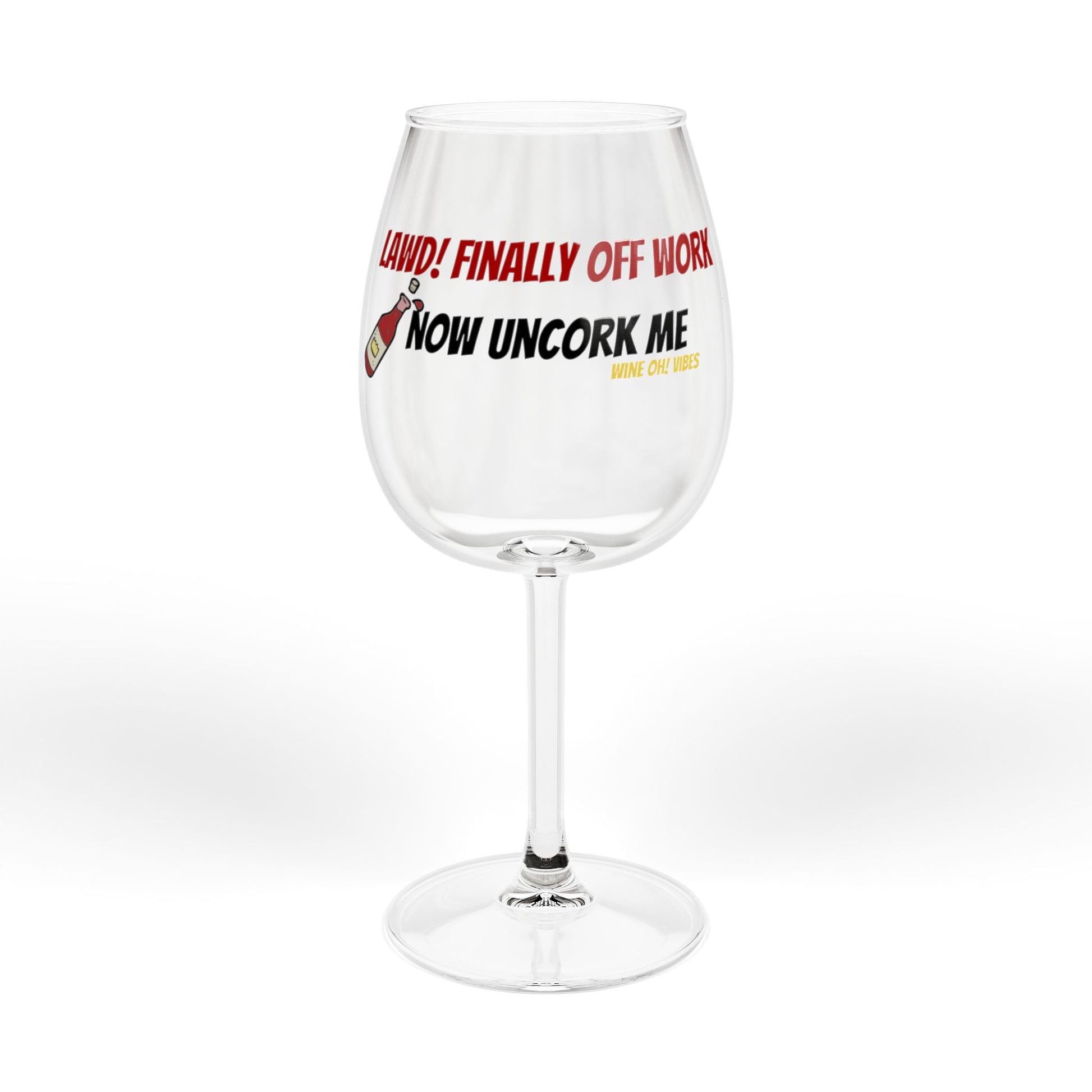 Finally Off Work, Now Uncork Me—the 12oz wine glass that speaks your language. This sleek stemware delivers that premium feel with a modern silhouette designed for serious sipping. The single-side glossy print bursts with vibrant colors on crystal-clear glass, making every pour a vibe. Whether you're unwinding after a brutal day or celebrating the small wins, this glass gets it. Balanced, elegant, and unapologetically cheeky. Hand wash to keep the witty design looking sharp.
